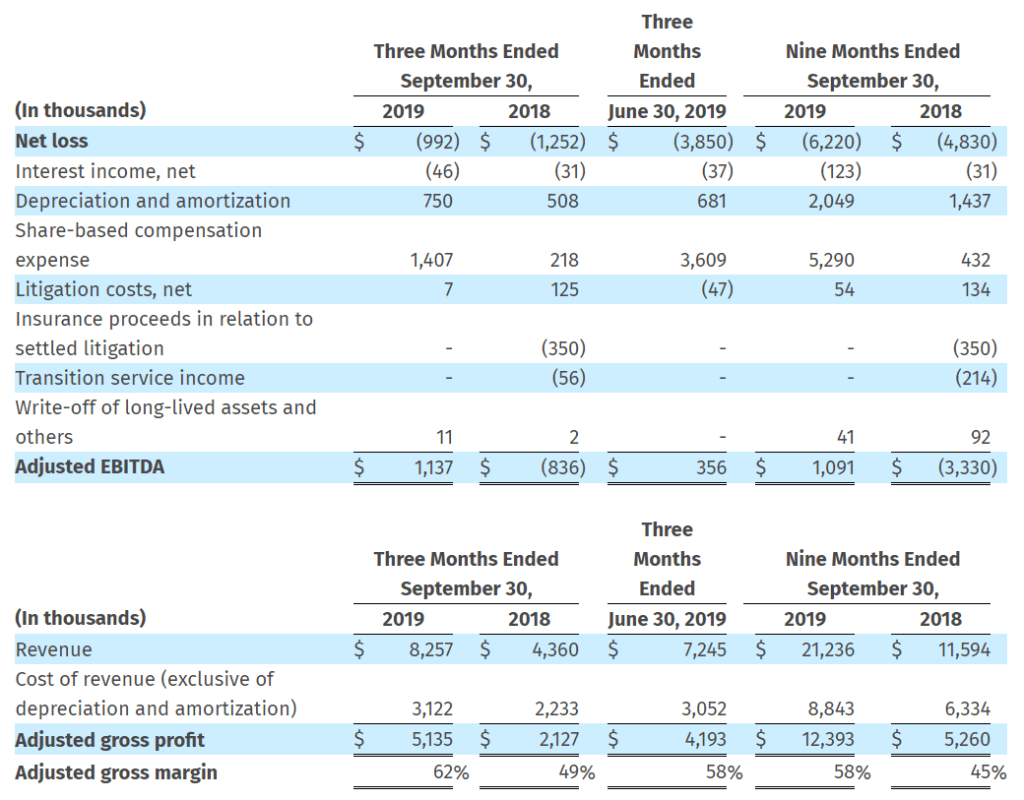 - Cash and cash equivalents were $13.3 million as of September 30, 2019. To meet demand and accelerate growth, we raised $7.5 million during the quarter in strategic growth financing from existing and new investors through the sale of 681,000 shares of common stock in a registered direct offering.