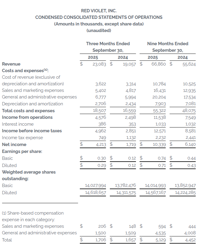 BOCA RATON, Fla., Nov. 05, 2025 (GLOBE NEWSWIRE) — Red Violet, Inc. (NASDAQ: RDVT), a leading analytics and information solutions provider, today announced financial results for the quarter ended September 30, 2025.