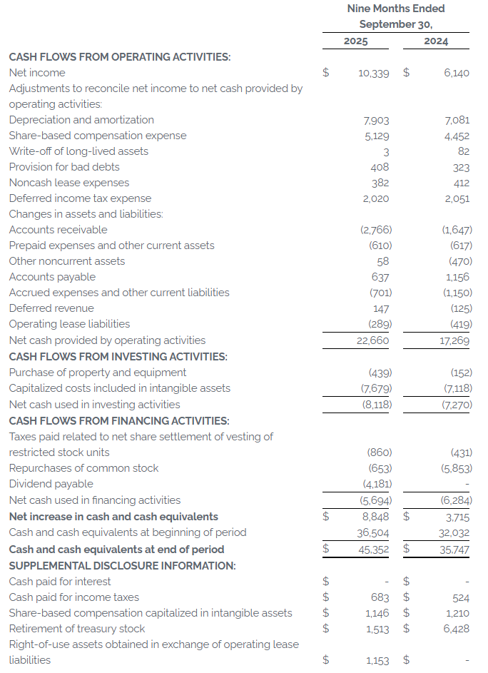 Management evaluates the financial performance of our business on a variety of key indicators, including non-GAAP metrics of adjusted EBITDA, adjusted EBITDA margin, adjusted net income, adjusted earnings per share, adjusted gross profit, adjusted gross margin, and free cash flow (“FCF”). Adjusted EBITDA is a non-GAAP financial measure equal to net income, the most directly comparable financial measure based on US GAAP, excluding interest income, income tax expense, depreciation and amortization, share-based compensation expense, acquisition-related costs, litigation costs, and write-off of long-lived assets. We define adjusted EBITDA margin as adjusted EBITDA as a percentage of revenue. Adjusted net income is a non-GAAP financial measure equal to net income, the most directly comparable financial measure based on US GAAP, adjusted to exclude share-based compensation expense, amortization of share-based compensation capitalized in intangible assets, acquisition-related costs, litigation costs, and write-off of long-lived assets, and to include the tax effect of adjustments. We define adjusted earnings per share as adjusted net income divided by the weighted average shares outstanding. We define adjusted gross profit as gross profit plus depreciation and amortization of certain intangible assets, and adjusted gross margin as adjusted gross profit as a percentage of revenue. We define FCF as net cash provided by operating activities reduced by purchase of property and equipment, and capitalized costs included in intangible assets.