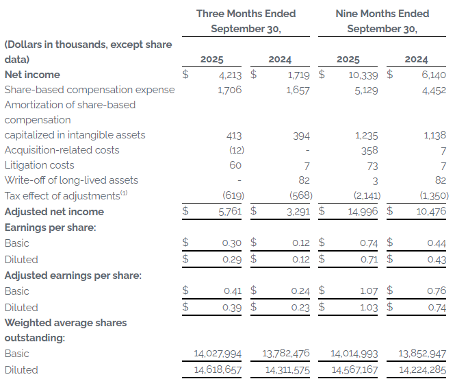 - Adjusted net income increased 75% to $5.8 million, which resulted in adjusted earnings of $0.41 and $0.39 per basic and diluted share, respectively.