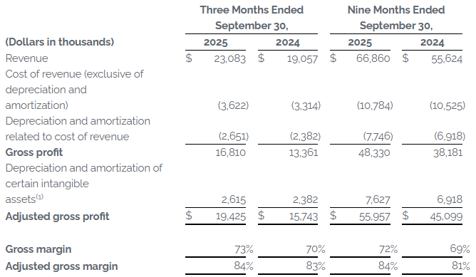 - Adjusted gross profit increased 23% to $19.4 million. Adjusted gross margin increased to 84% from 83%.